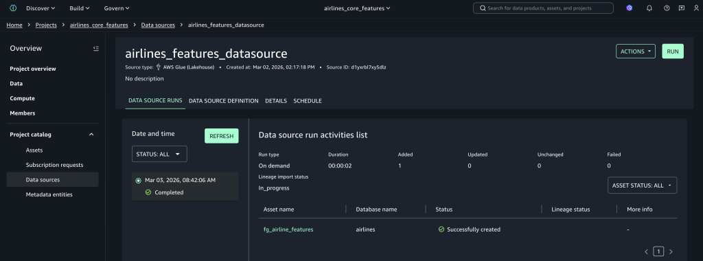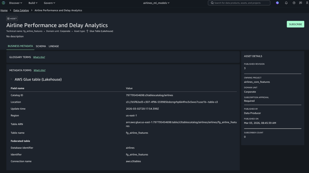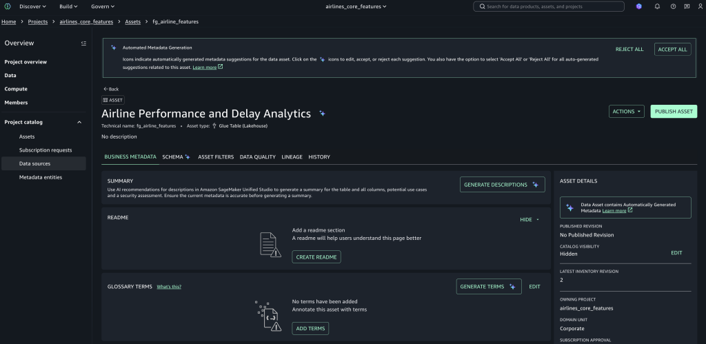 fg_airline_featuresasset, which was created by the data source job. - Choose Publish asset, add metadata and descriptions, and complete publishing to make it discoverable across projects.