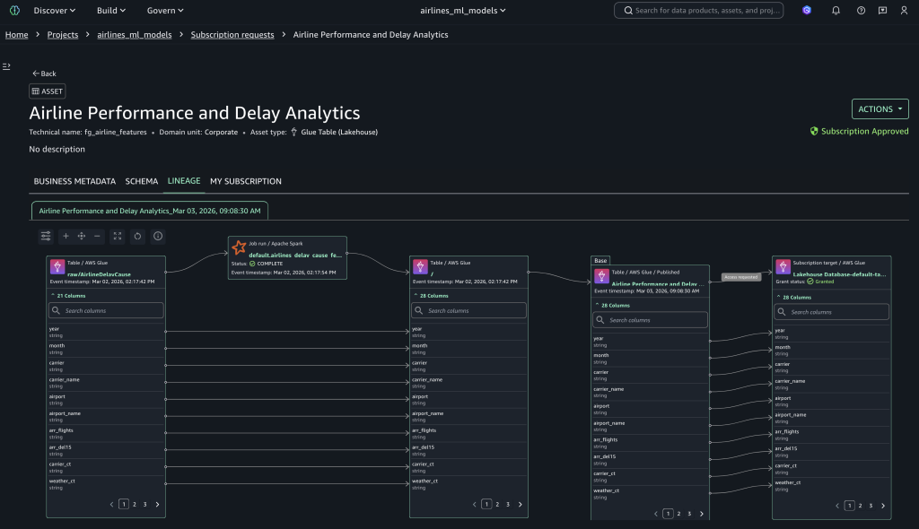 airline_featurestable with metadata for improved discoverability and governance. - After validation and approval, the data engineer publishes the