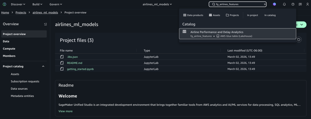 airline_featurestable into SageMaker Catalog for organization-wide access. - Data scientist opens the ML project, uses AI powered search to find the