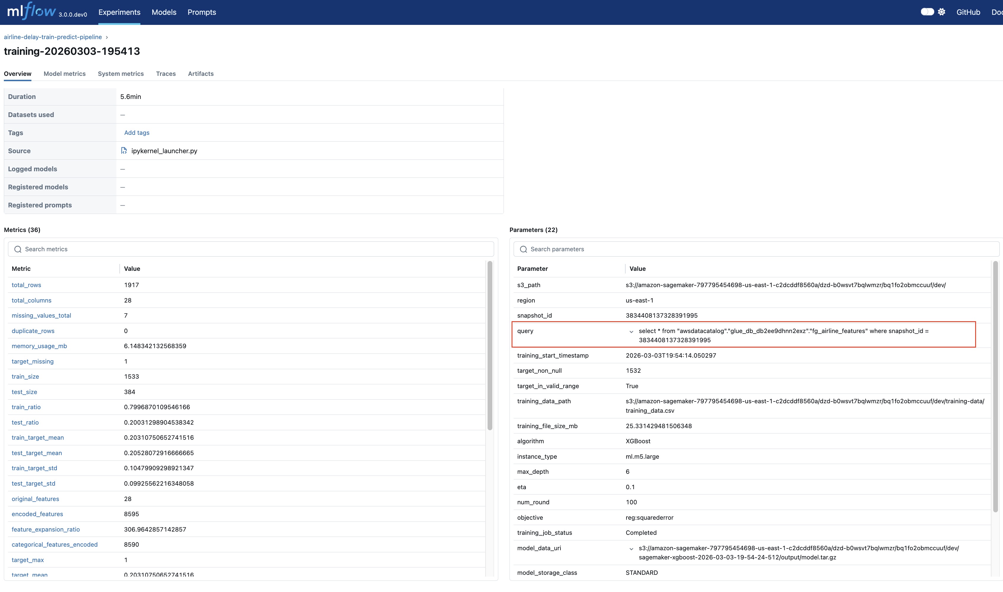 - train_model_with_comprehensive_metrics: This function persists the training dataframe to Amazon S3 and uses that dataset as input to SageMaker XGBoost estimator to train the airline delay prediction regression model. The training experiment parameters and the metrics S3 table snapshot ID and query are logged to the MLflow experiment for reproducibility as shown in the following figure.